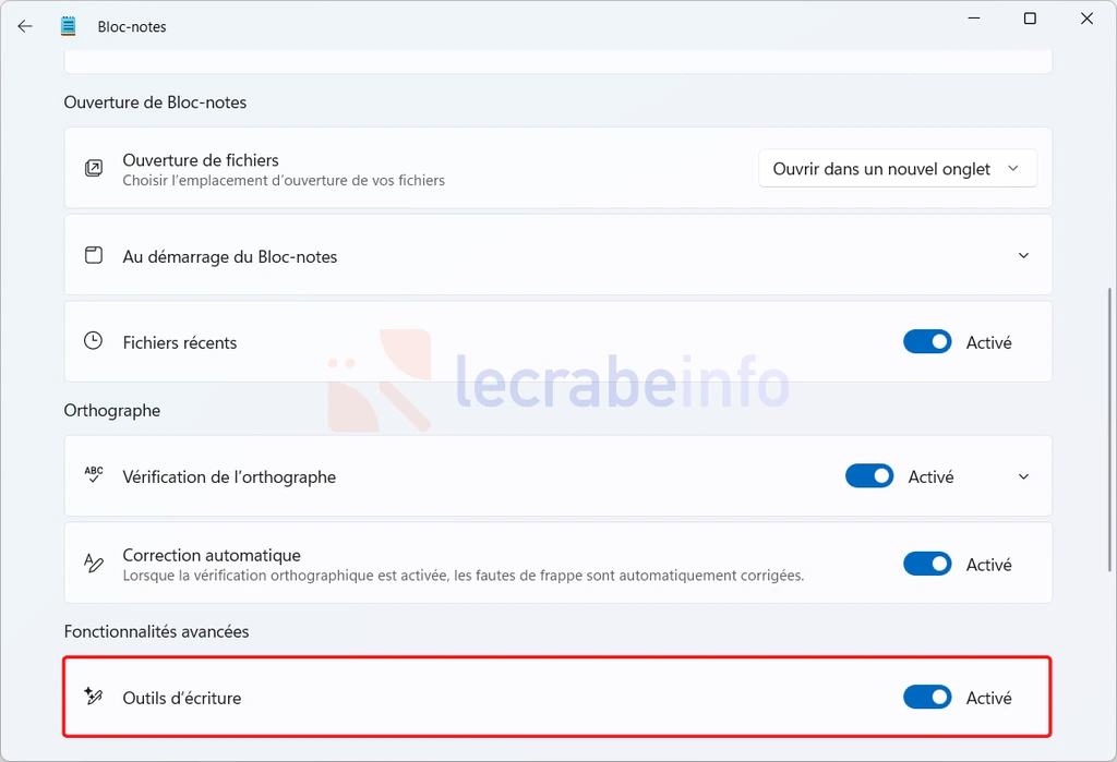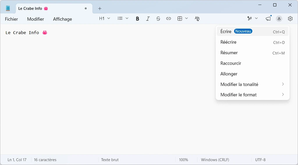 Dans la nouvelle version du Bloc-notes (11.2512.28.0), l’icône Copilot laisse place à un simple pictogramme en forme de stylo. Le menu associé abandonne lui aussi toute référence à Copilot pour adopter une appellation plus générique : « Outils d’écriture ». Par contre, sur le fond, rien ne change. Les fonctionnalités restent strictement identiques : écriture de texte, résumé de texte, ajustement du ton… tous les outils basés sur l’IA sont toujours présents et fonctionnent comme auparavant.