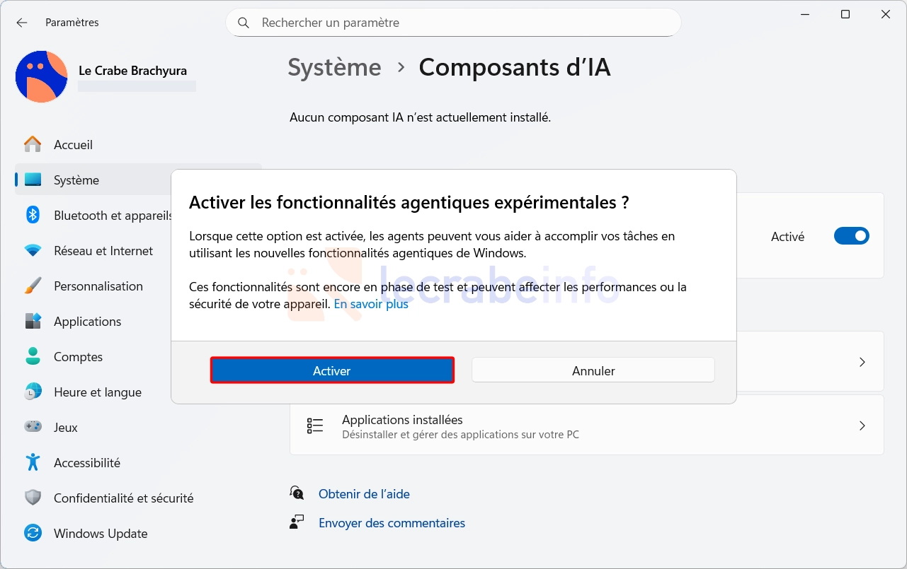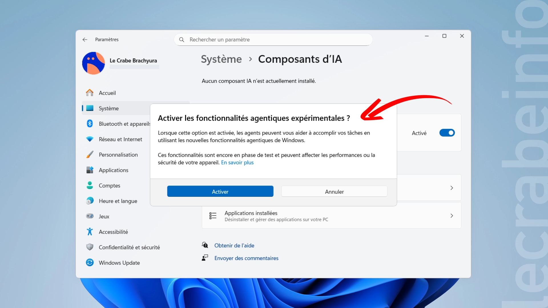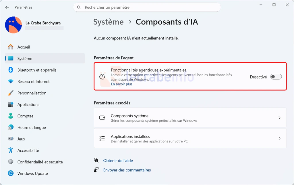 Parmi les nouveautés de cette préversion de Windows 11, vous trouverez une nouvelle option intéressante : « Fonctionnalités agentiques expérimentales », accessible depuis les Paramètres → Système → Composants d’IA. Elle permet d’activer des agents intelligents capables d’interagir avec vos applications, vos fichiers, voire de réaliser des tâches en votre nom.