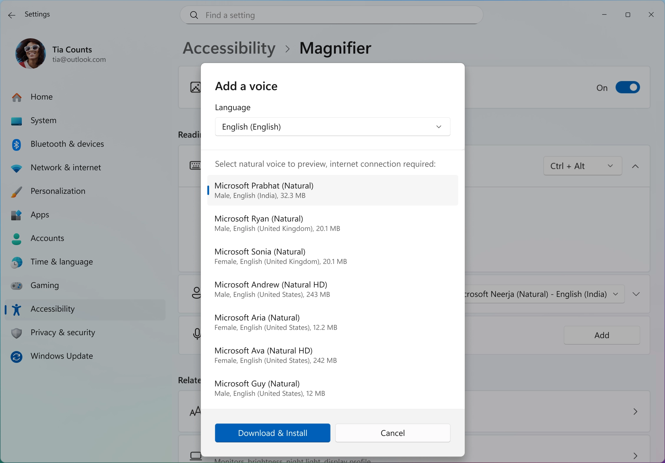 Cette préversion de Windows 11 introduit des voix haute définition pour les applications d’accessibilité Narrateur et Loupe. Ces voix HD utilisent l’IA générative pour ajuster le ton et le rythme, afin de proposer une élocution plus naturelle et expressive. L’objectif est double :