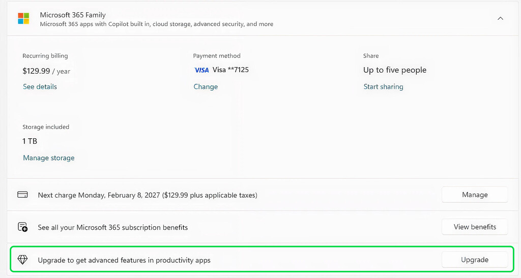 Une invite de mise à niveau pour Microsoft 365 Famille dans les Paramètres de Windows 11, page Comptes – © Microsoft
