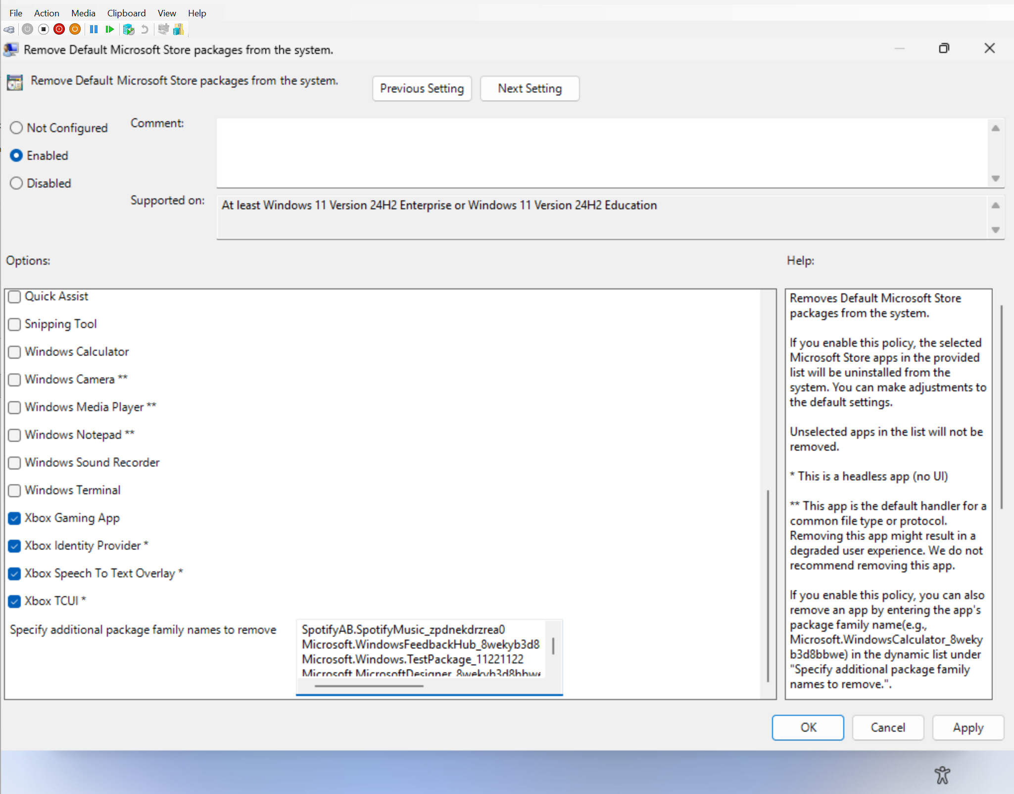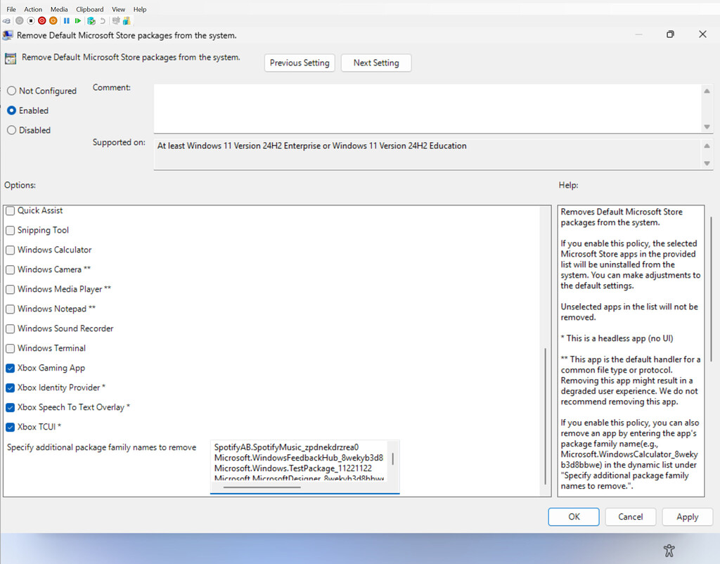 La stratégie de groupe « Supprimer les packages Microsoft Store par défaut » — permet aux administrateurs de définir quelles applications préinstallées doivent être automatiquement retirées de toutes les machines de leur parc — évolue avec l’ajout d’une liste dynamique. Les administrateurs peuvent désormais y ajouter le nom du package de n’importe quelle application au format MSIX/APPX (par exemple Microsoft.WindowsNotepad_8wekyb3d8bbwe pour le Bloc-notes) afin de la supprimer automatiquement sur l’ensemble des machines du parc.