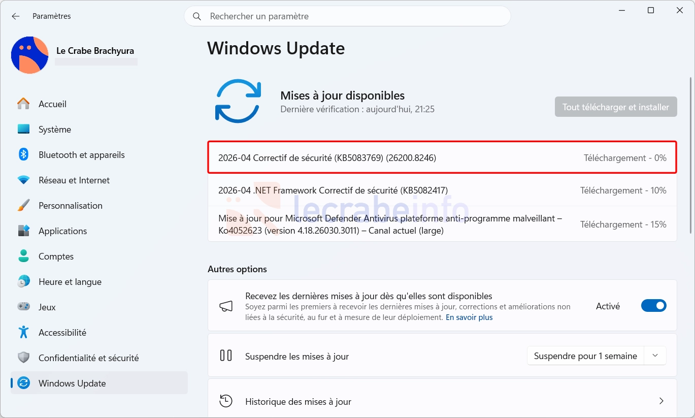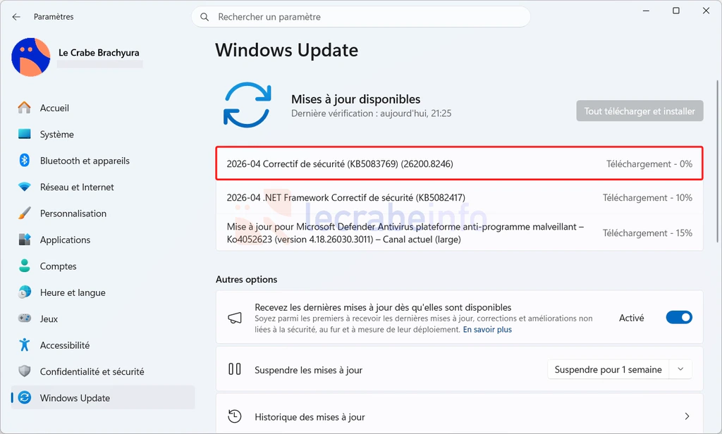 La mise à jour d’avril 2026 (KB5083769) sur Windows Update / Le Crabe Info