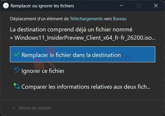 La nouvelle boîte de dialogue Remplacer, Ignorer ou Comparer les fichiers en mode sombre / Le Crabe Info