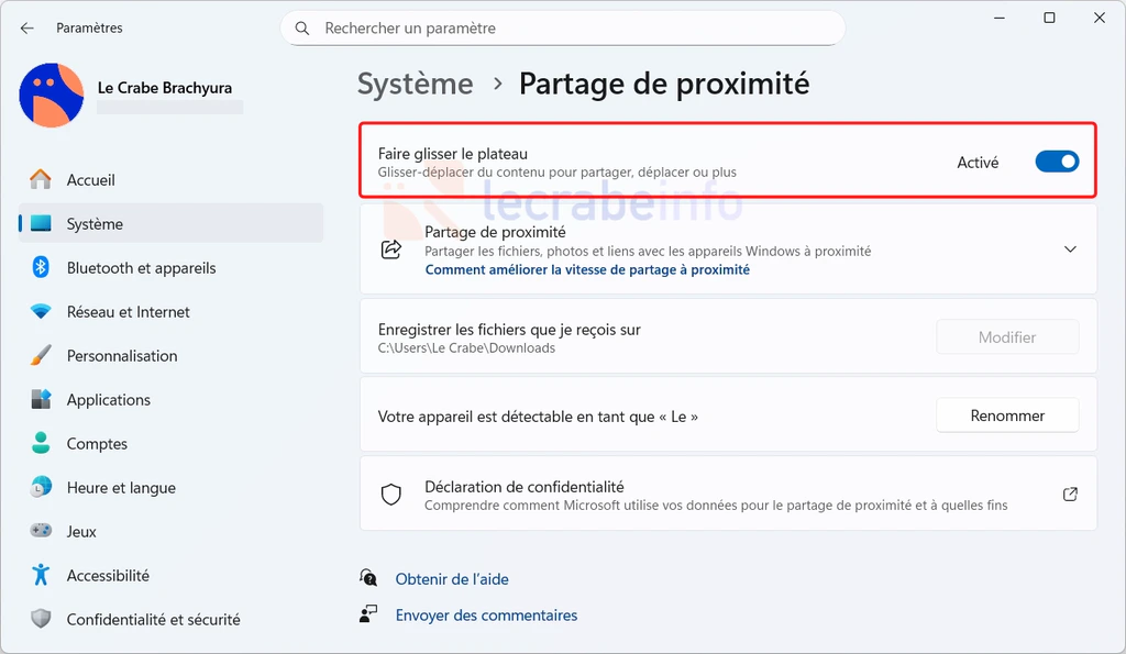De plus, il est maintenant possible d’activer ou de désactiver le plateau de partage depuis les Paramètres -> Système -> Partage de proximité.
