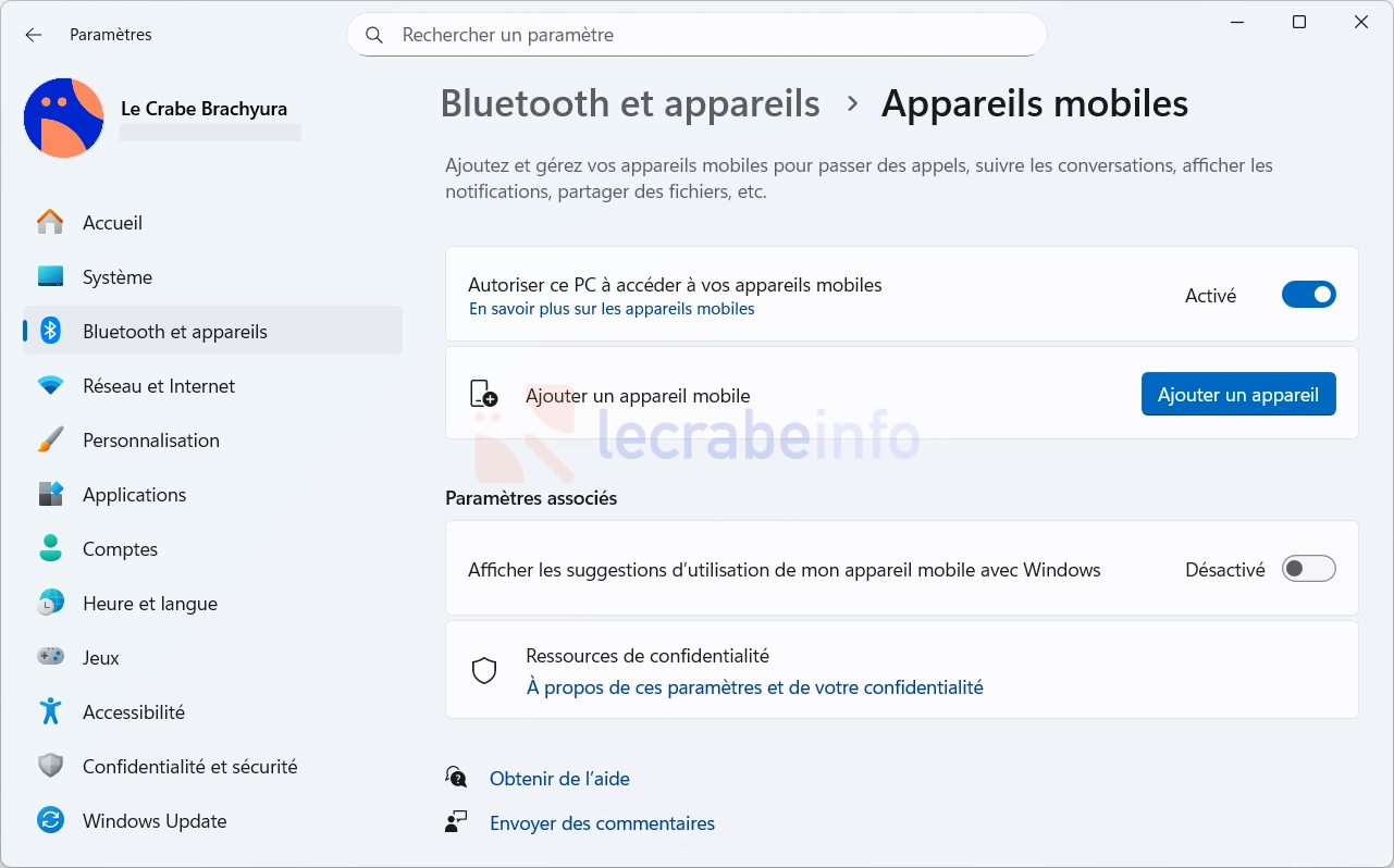 La nouvelle page « Appareils mobiles » dans les Paramètres pour gérer et ajouter ses appareils mobiles / Le Crabe Info