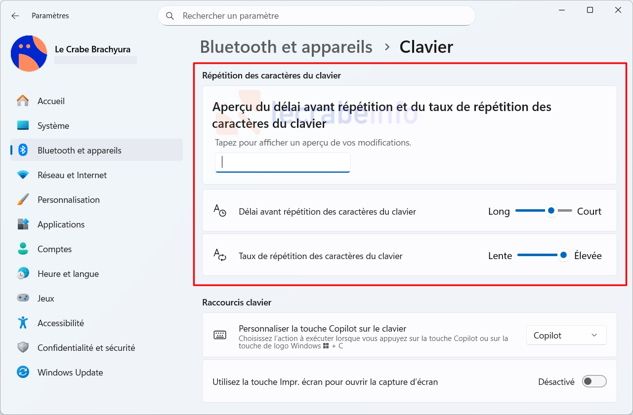 Les paramètres de répétition des caractères du clavier dans les Paramètres / Le Crabe Info