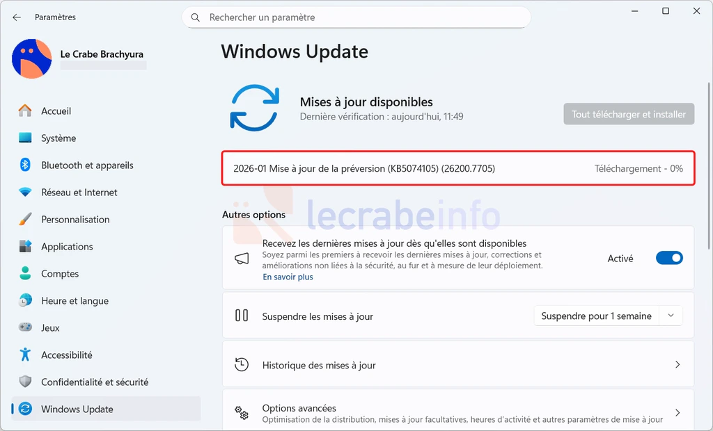 Téléchargement de la mise à jour facultative KB5074105 pour Windows 11 sur Windows Update / Le Crabe Info
