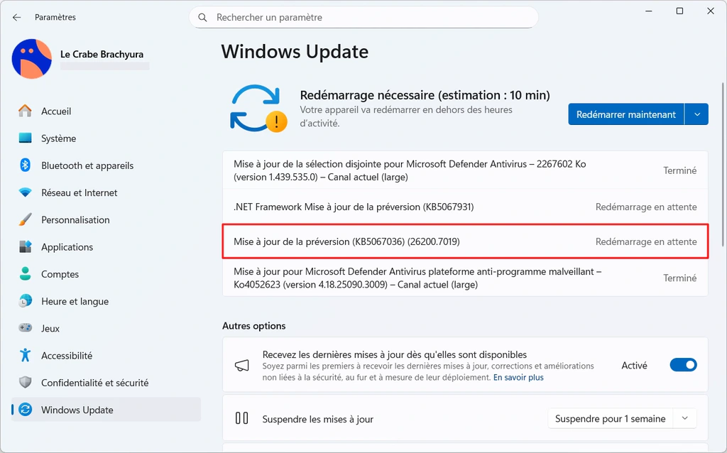 - La mise à jour « Mise à jour de la préversion (KB5067036) » se téléchargement et s’installe automatiquement.