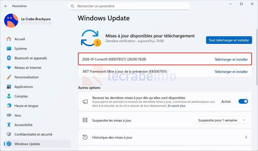 La mise à jour KB5078127 qui contient le correctif d’urgence est proposée automatiquement via Windows Update pour les ordianteurs concernés. Un redémarrage du système est nécessaire pour finaliser l’installation.