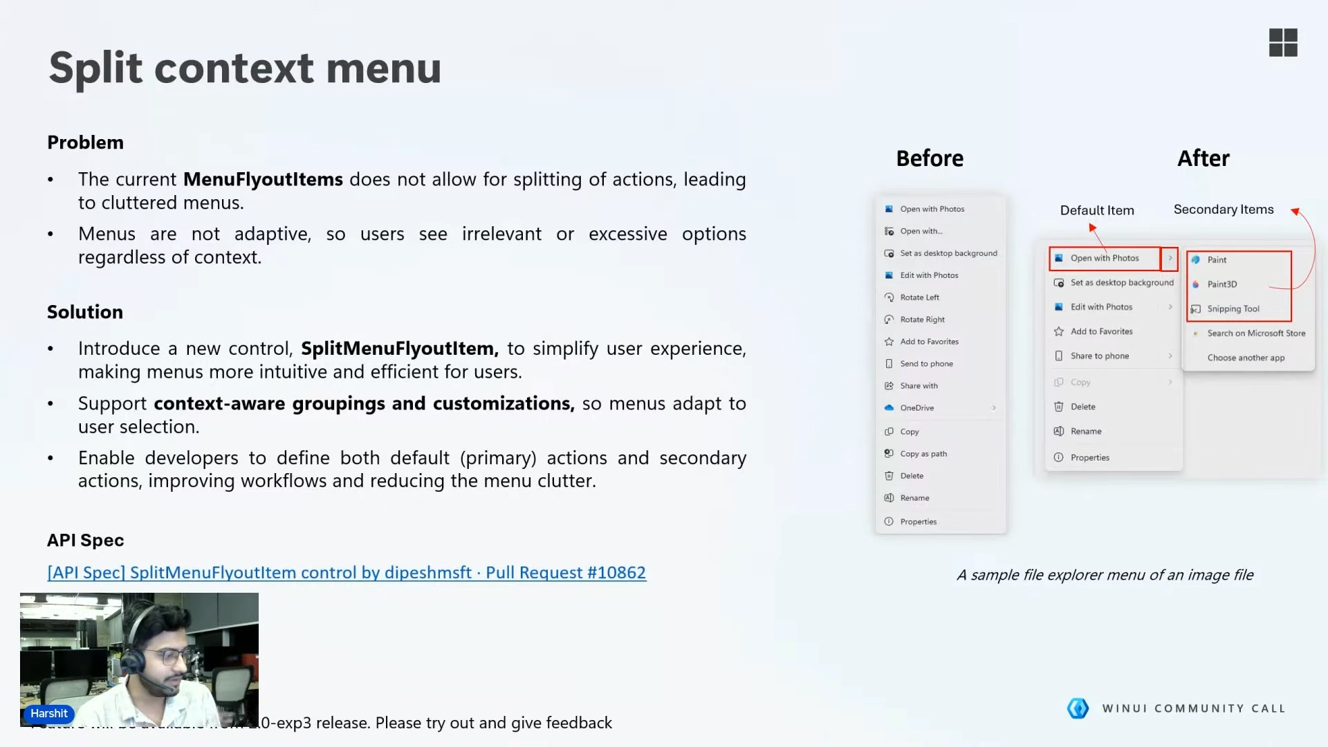 L’appel communautaire autour de WinUI qui montre le menu contextuel avec la nouvelle interface « Split Context Menu » / Source : Microsoft