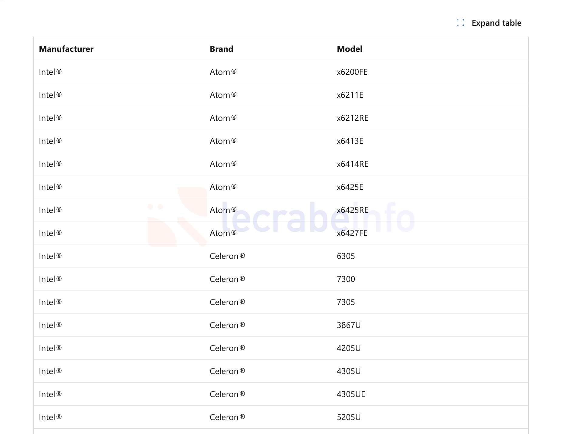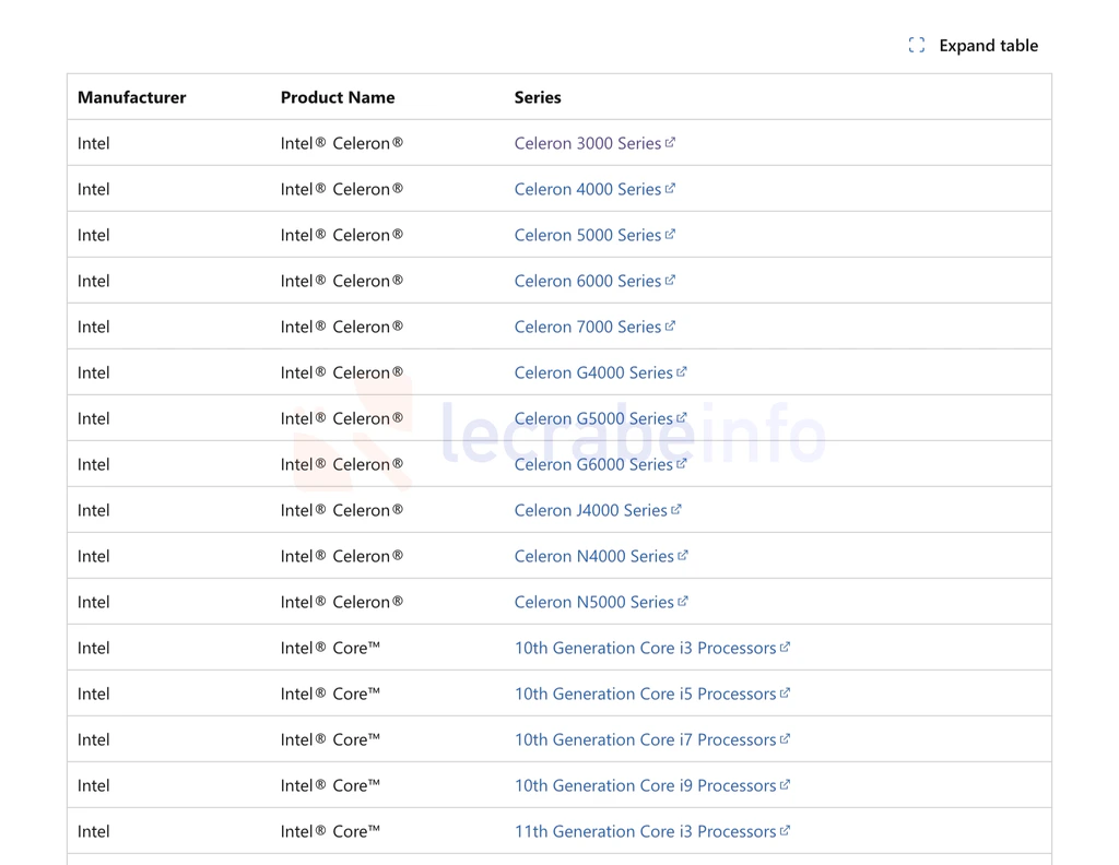 - Microsoft a juste modifié la présentation des processeurs Intel compatibles (qui est bien moins précise qu’avant) dans sa documentation.