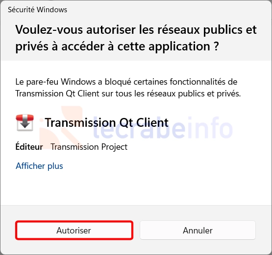 Windows peut vous demander si vous souhaitez autoriser Transmission à communiquer sur les réseaux publics et privés : cliquez sur Autoriser.