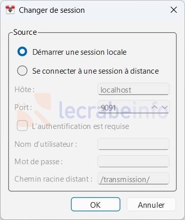 Au premier lancement, Transmission vous demandera de sélectionner une session. Sélectionnez Démarrer une session locale, puis cliquez sur OK.