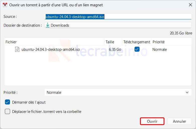 Une fenêtre s’ouvre avec les détails du torrent. Vous pouvez :