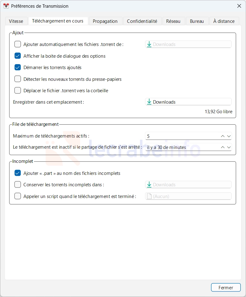 Dans l’onglet Réseau, Transmission utilise par défaut le port 51413 pour les connexions entrantes. Vous pouvez le laisser tel quel.