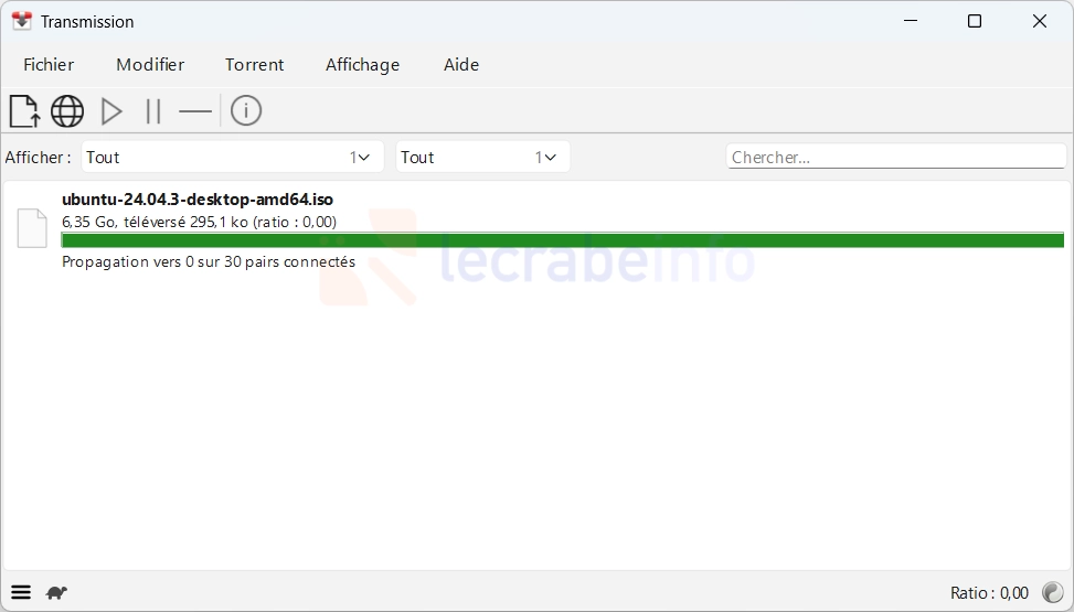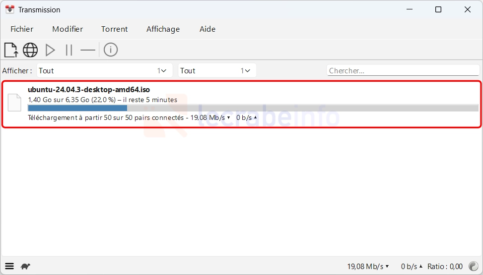 Le téléchargement du fichier via le réseau BiTorrent commence. La barre de progression s’affiche en bleu. Vous verrez plusieurs informations dans l’interface de Transmission :