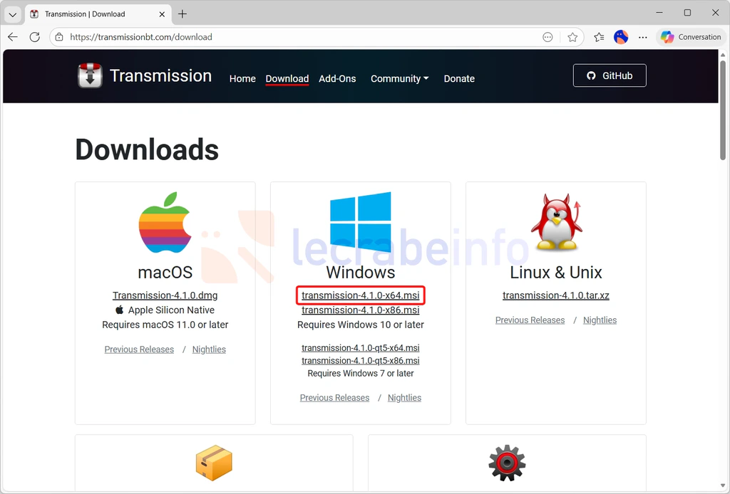 Si vous êtes sur Windows, cliquez sur transmission-X.X.X-x64.msi.