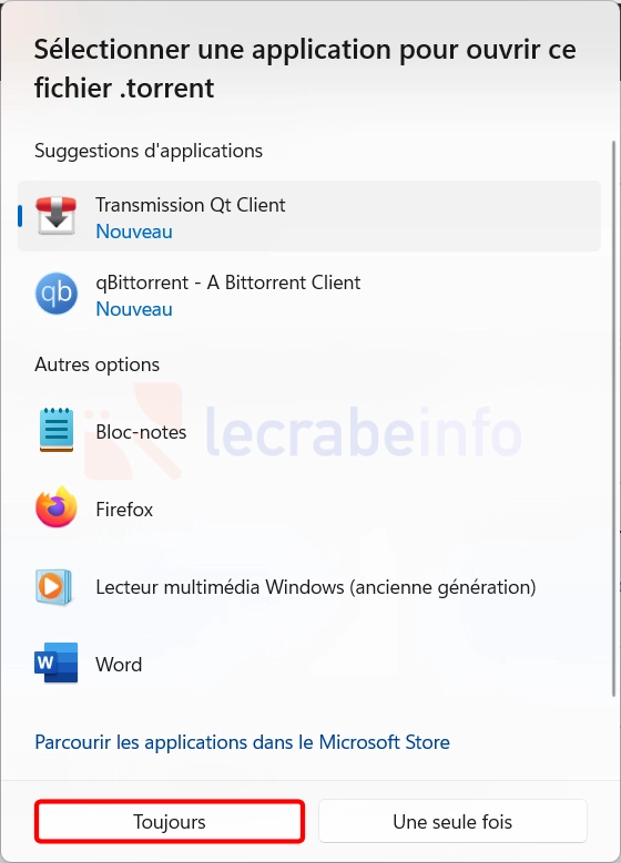 Si c’est la première fois que vous ouvrez un fichier .torrent, Windows vous demandera de choisir une application pour ouvrir ce type de fichier. Sélectionnez Transmission Qt Client puis cliquez sur Toujours.