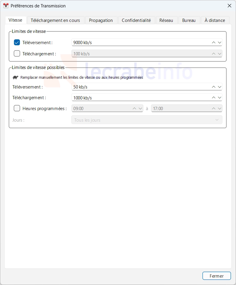 Note : si votre vitesse d’upload est de 100 Mb/s (faites le test sur speedtest.net), 50 % correspondent à 50 Mb/s, soit environ 6 250 kB/s à renseigner dans Transmission (50 ÷ 8 × 1 000).