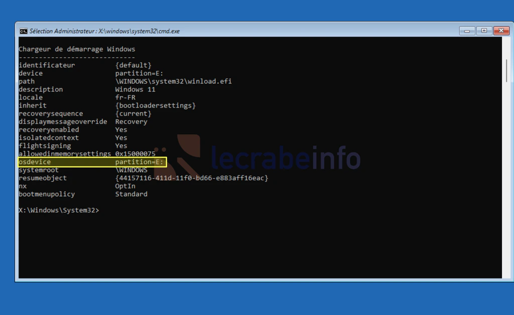 -> Dans les commandes suivantes, remplacez X: par la lettre attribuée à votre partition Windows.