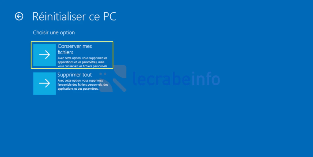 Si l’erreur 0xc0000001 persiste malgré les solutions précédentes, cela signifie que des fichiers essentiels du système sont trop endommagés pour être restaurés. Dans ce cas, une réinitialisation de Windows devrait normalement résoudre le problème qui empêche Windows de démarrer.