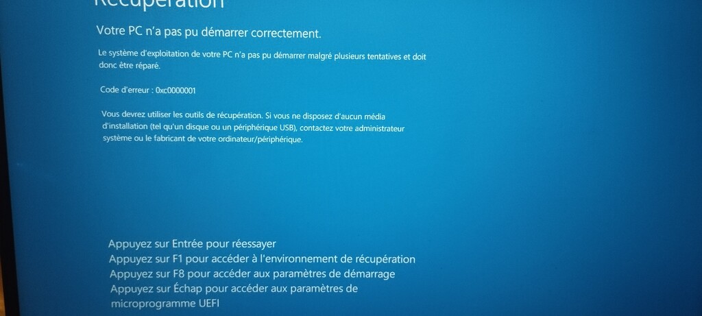 Le code d’erreur 0xc0000001 apparaît au démarrage de Windows, dans un écran bleu « Récupération » indiquant que le système d’exploitation ne peut pas démarrer malgré plusieurs tentatives. Il peut s’accompagner du message « Votre PC n’a pas pu démarrer correctement » ou « Votre PC doit être réparé ».