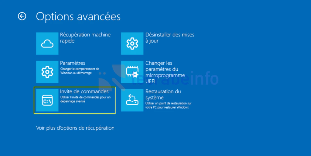 Cliquez sur Dépannage → Options avancées → Invite de commandes.