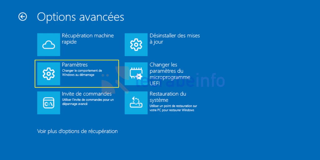Cliquez sur Dépannage → Options avancées → Paramètres.