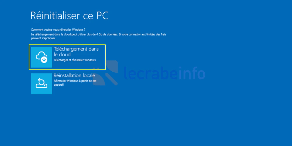 - Téléchargement dans le cloud (recommandé) : Windows récupère une image système propre depuis les serveurs Microsoft. Garantit une image saine et à jour, mais nécessite une bonne connexion Internet.