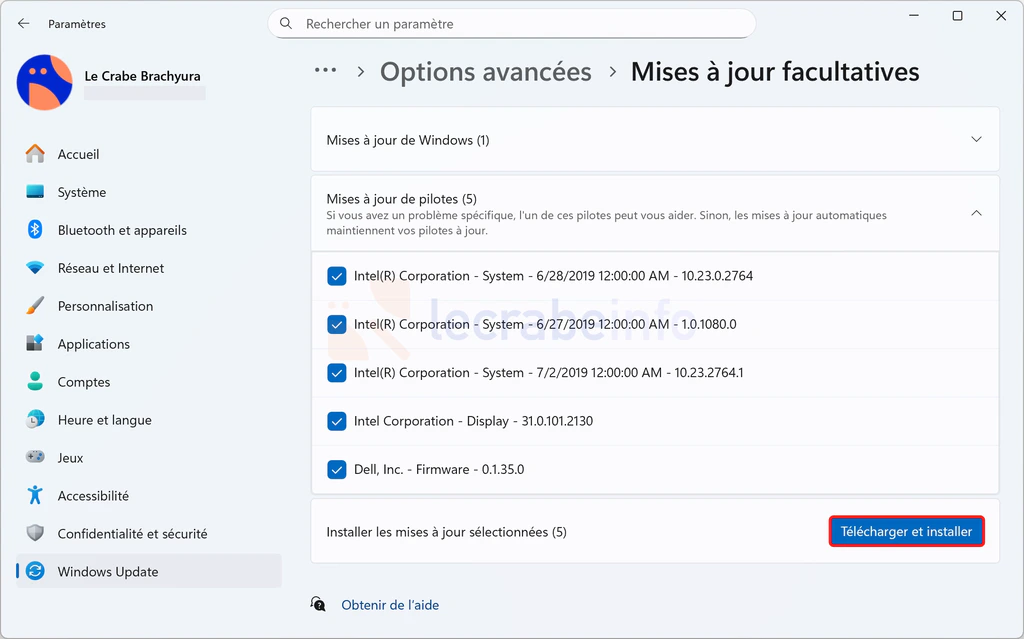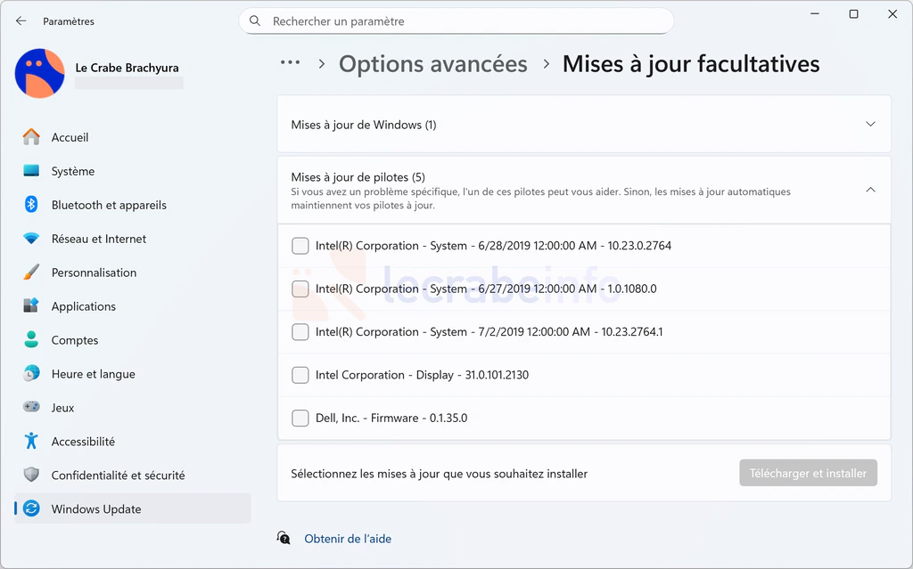 4. Développez la section Mises à jour de pilotes, puis cochez les cases des pilotes des périphériques que vous souhaitez installer.