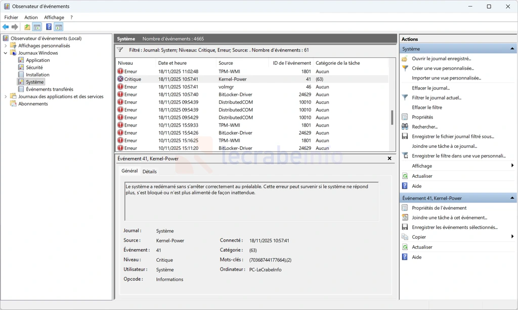 Une fois Windows relancé, les résultats peuvent être consultés dans l’Observateur d’événements. Si des erreurs sont signalées, cela indique un problème potentiel lié à la mémoire, qui peut nécessiter une vérification matérielle plus approfondie. Si vous avez besoin d’aide, consultez ce tutoriel :