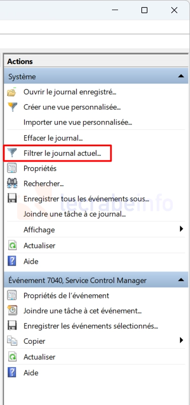 Dans le panneau de droite, cliquez sur Filtrer le journal actuel.