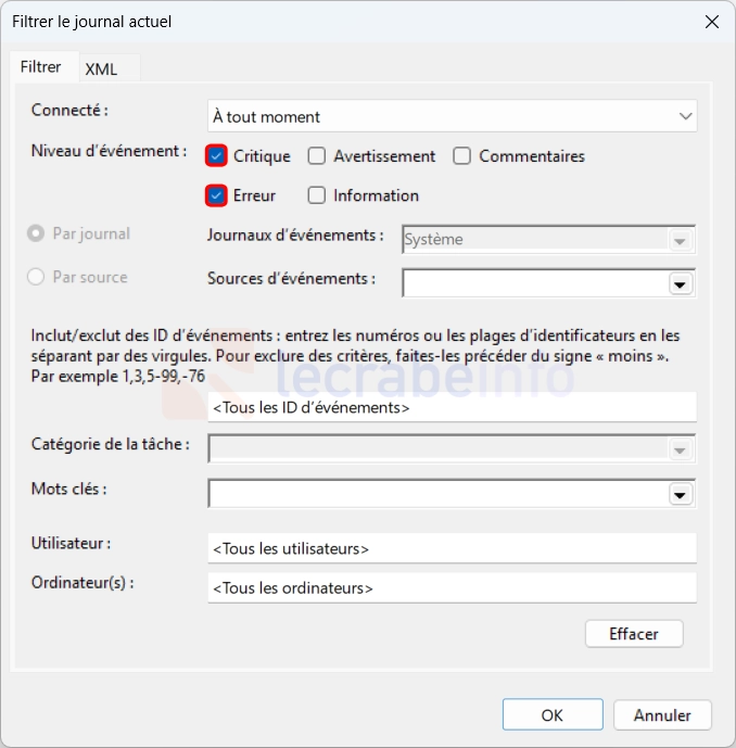 Cochez uniquement les niveaux d’événement Critique et Erreur, puis cliquez sur OK.
