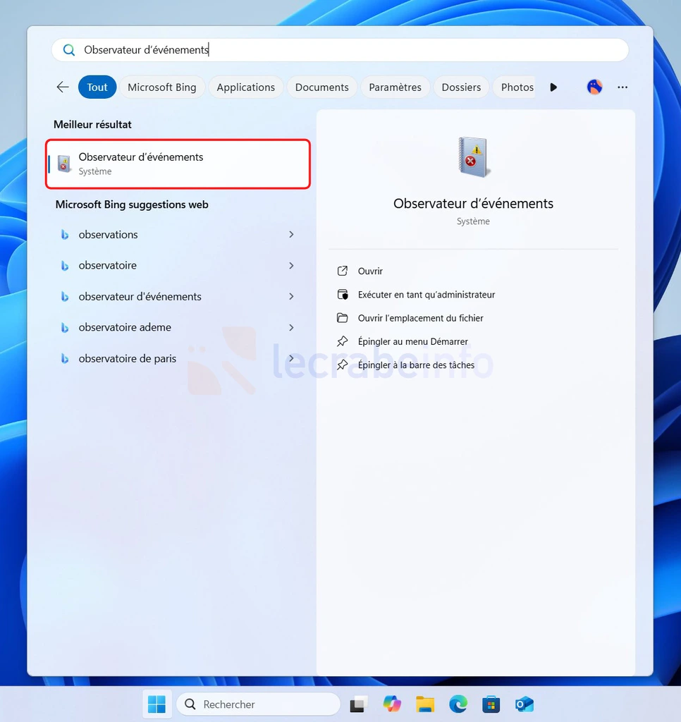 Ouvrez l’Observateur d’événements en tapant
