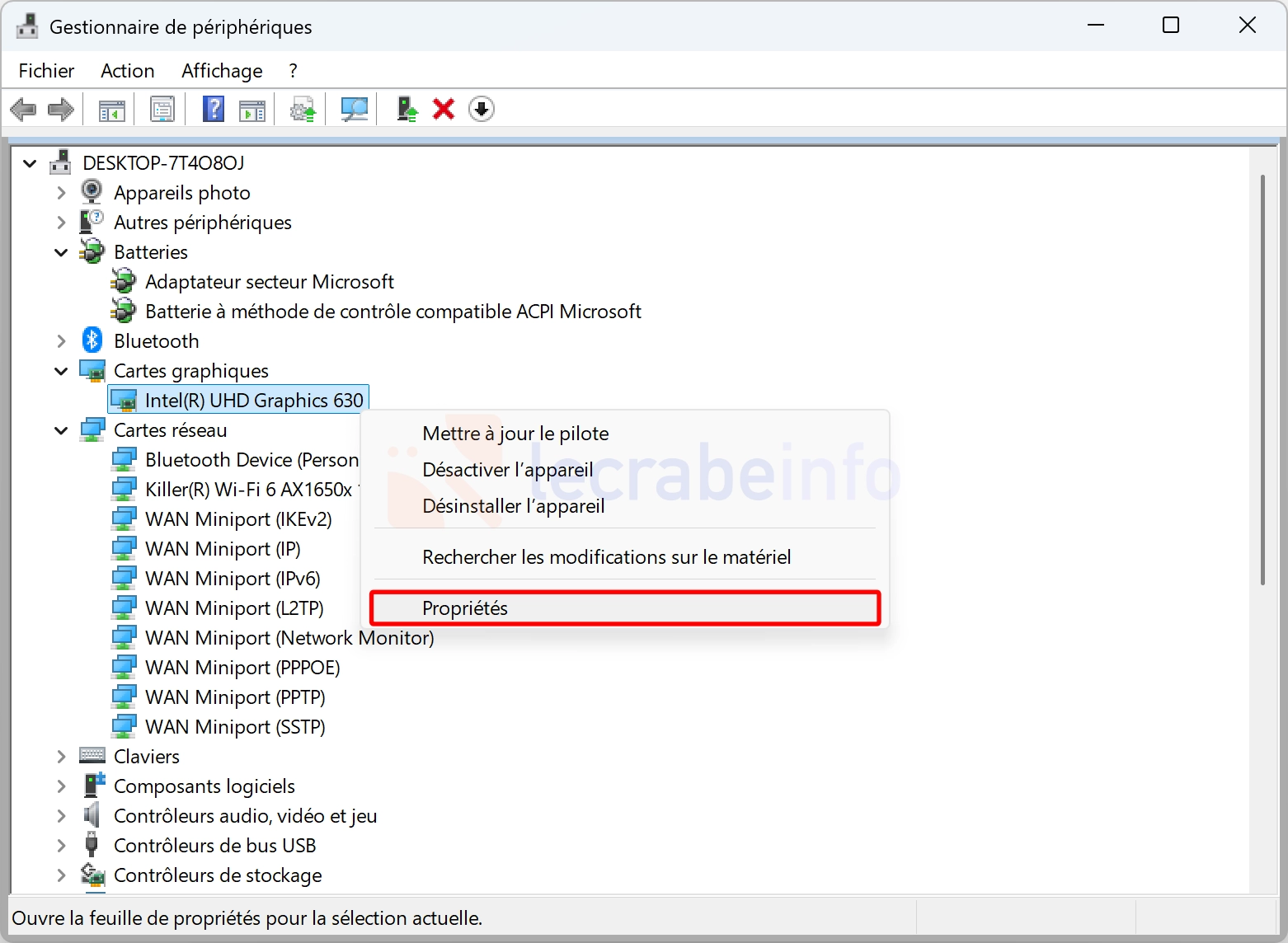 Faites un clic droit sur le matériel dont le pilote a été récemment mis à jour via Windows Update → Propriétés.