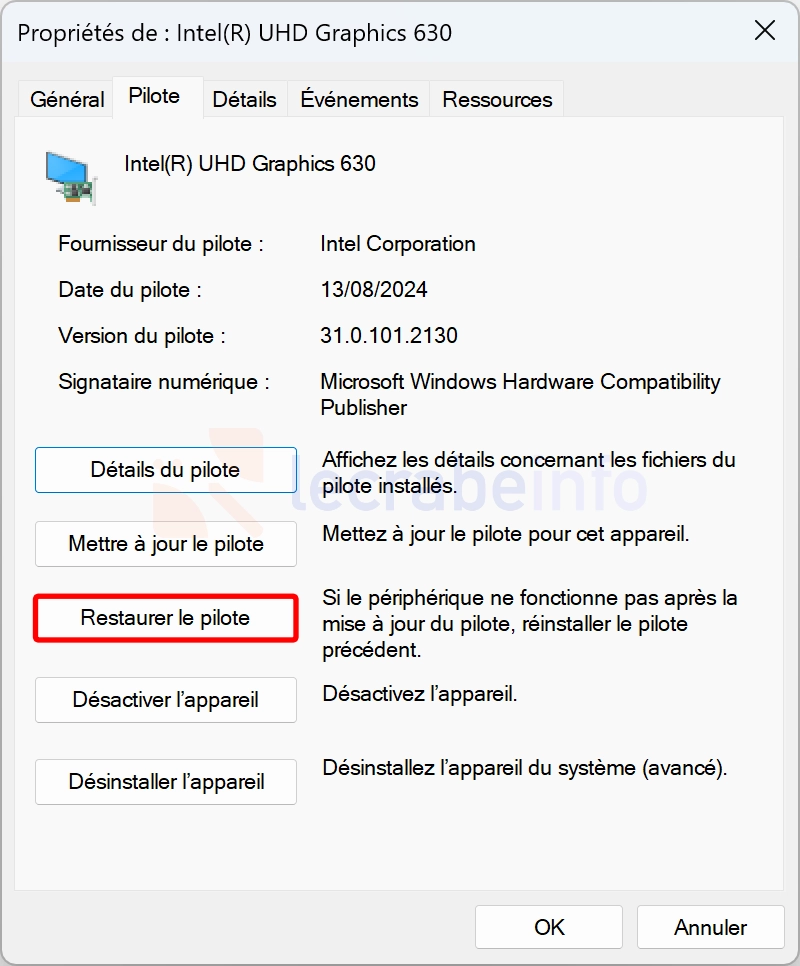 Dans l’onglet Pilote, cliquez sur le bouton Restaurer le pilote pour revenir à la dernière version du pilote qui fonctionnait.