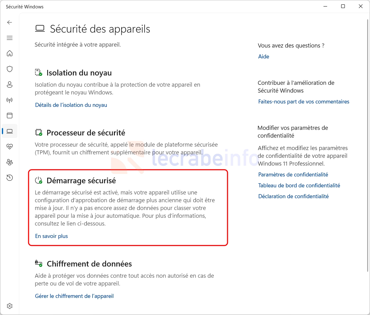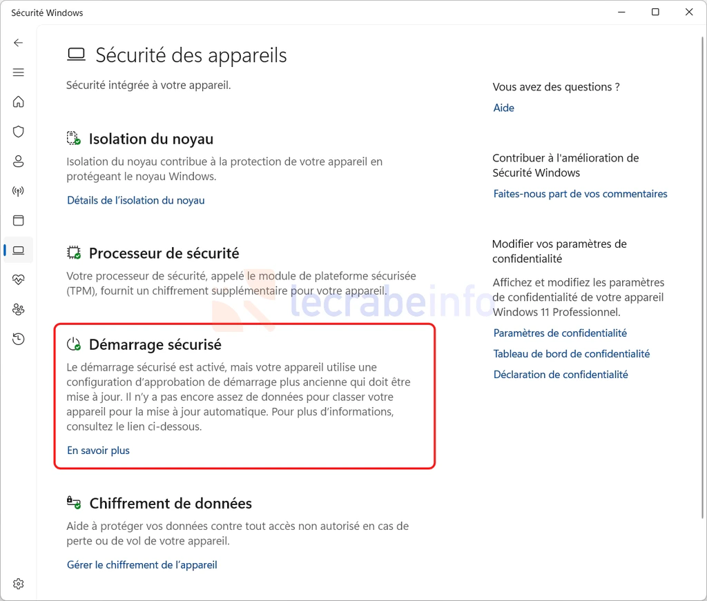 - Depuis avril 2026, l’application Sécurité Windows affiche l’état de la mise à jour des certificats Secure Boot via une icône vert, jaune ou rouge dans Sécurité des appareils -> Démarrage sécurisé.