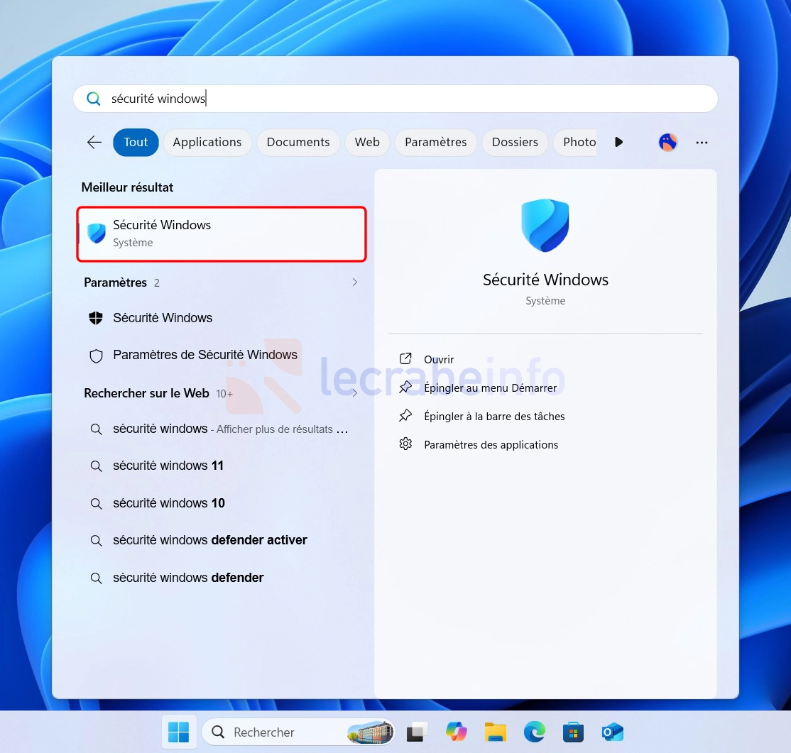 Ouvrez l’application Sécurité Windows en tapant « sécurité windows » dans la barre de recherche du menu Démarrer ou celui de la barre des tâches.