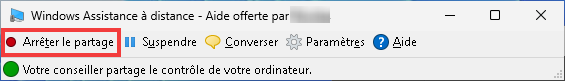 Pour se déconnecter et mettre fin à la session l’hôte dispose d’un bouton Arrêter le partage sur le bandeau supérieur de l’application.