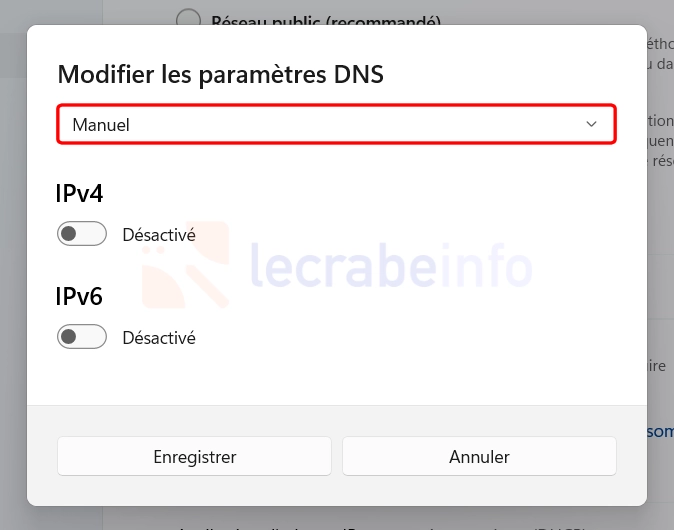 - Dans la fenêtre Modifier les paramètres DNS, choisissez Manuel.