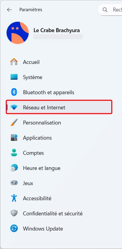 - Ouvrez les Paramètres -> Réseau et Internet.