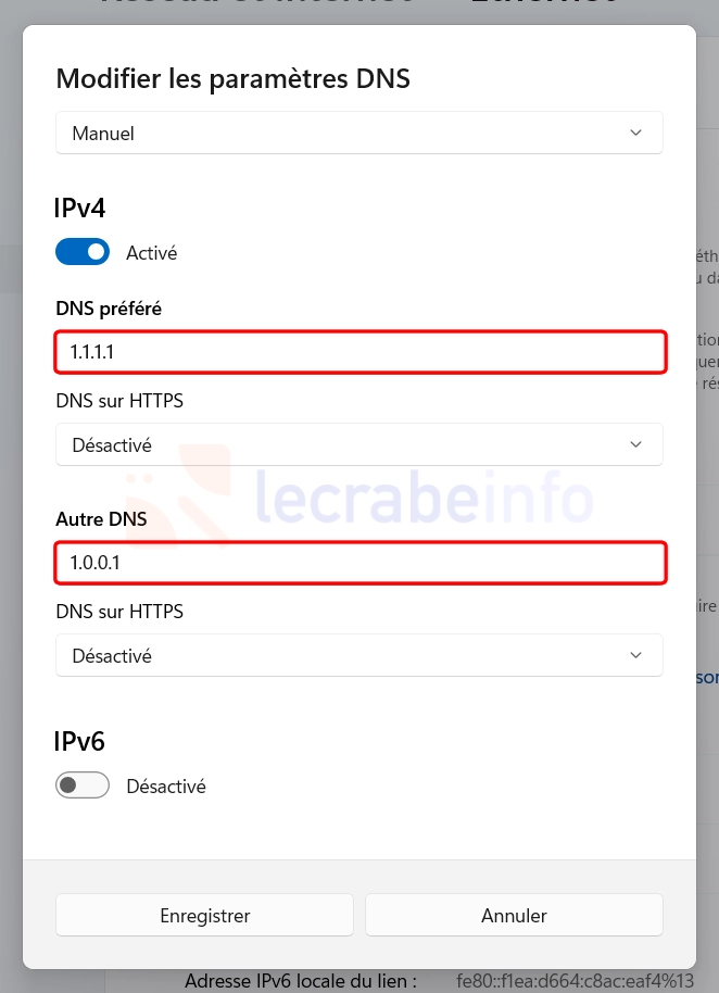 À titre d’exemple, nous allons configurer les DNS de Cloudflare (1.1.1.1 et 1.0.0.1), mais vous pouvez entrer n’importe quels serveurs DNS.