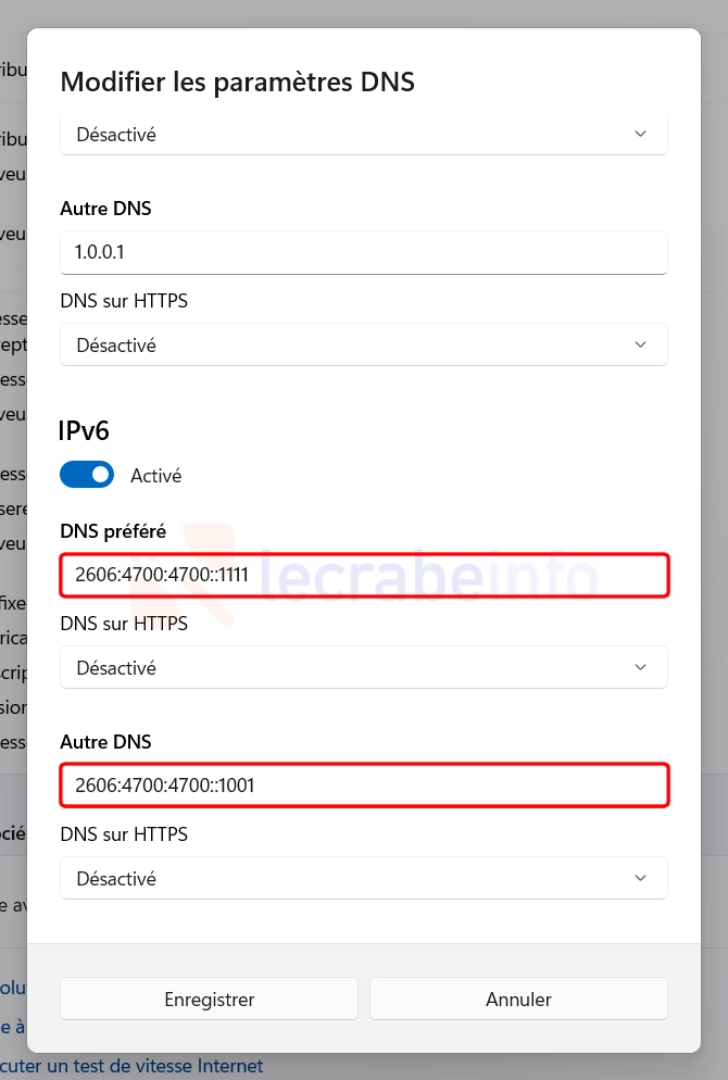 netsh interface ipv4 set dnsservers "Wi-Fi" static 1.1.1.1 primary netsh interface ipv4 add dnsservers "Wi-Fi" 1.0.0.1 index=2Et pour le protocole IPv6 :