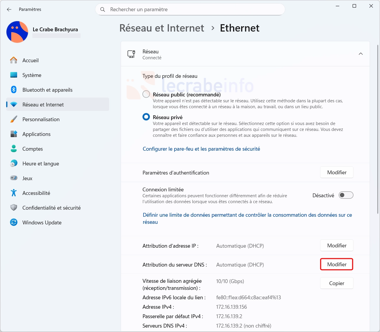 - Descendez à la ligne Attribution du serveur DNS, puis cliquez sur Modifier.
