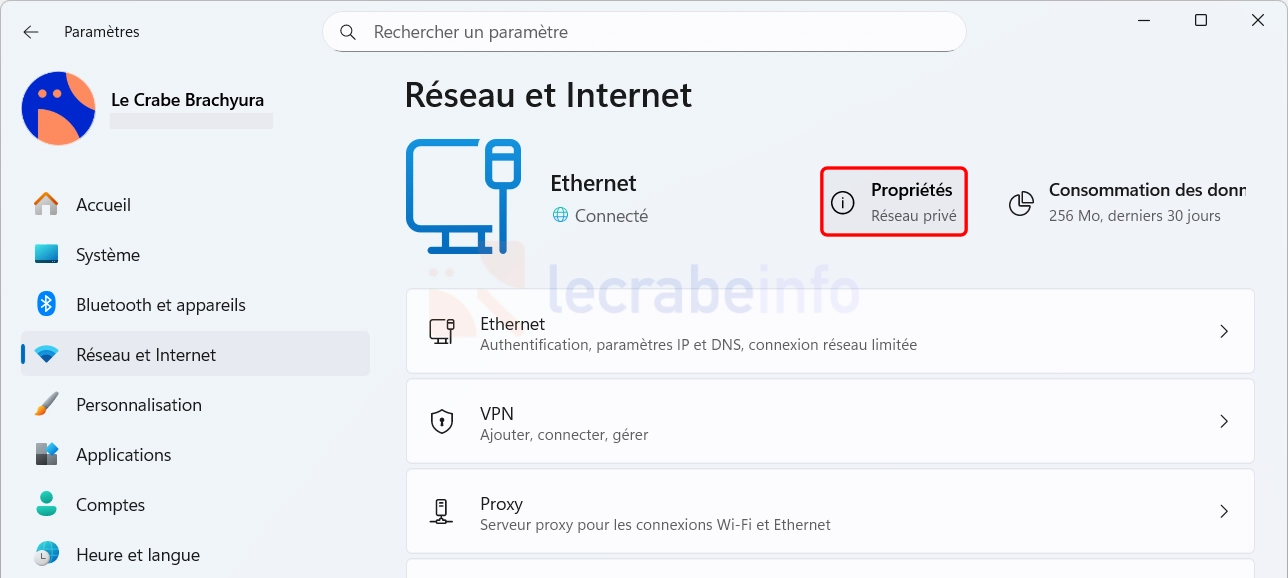 - Votre connexion réseau s’affiche en haut de la page. Cliquez sur Propriétés.