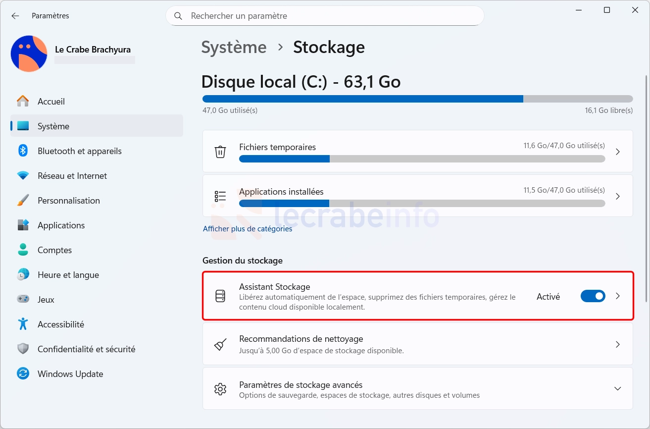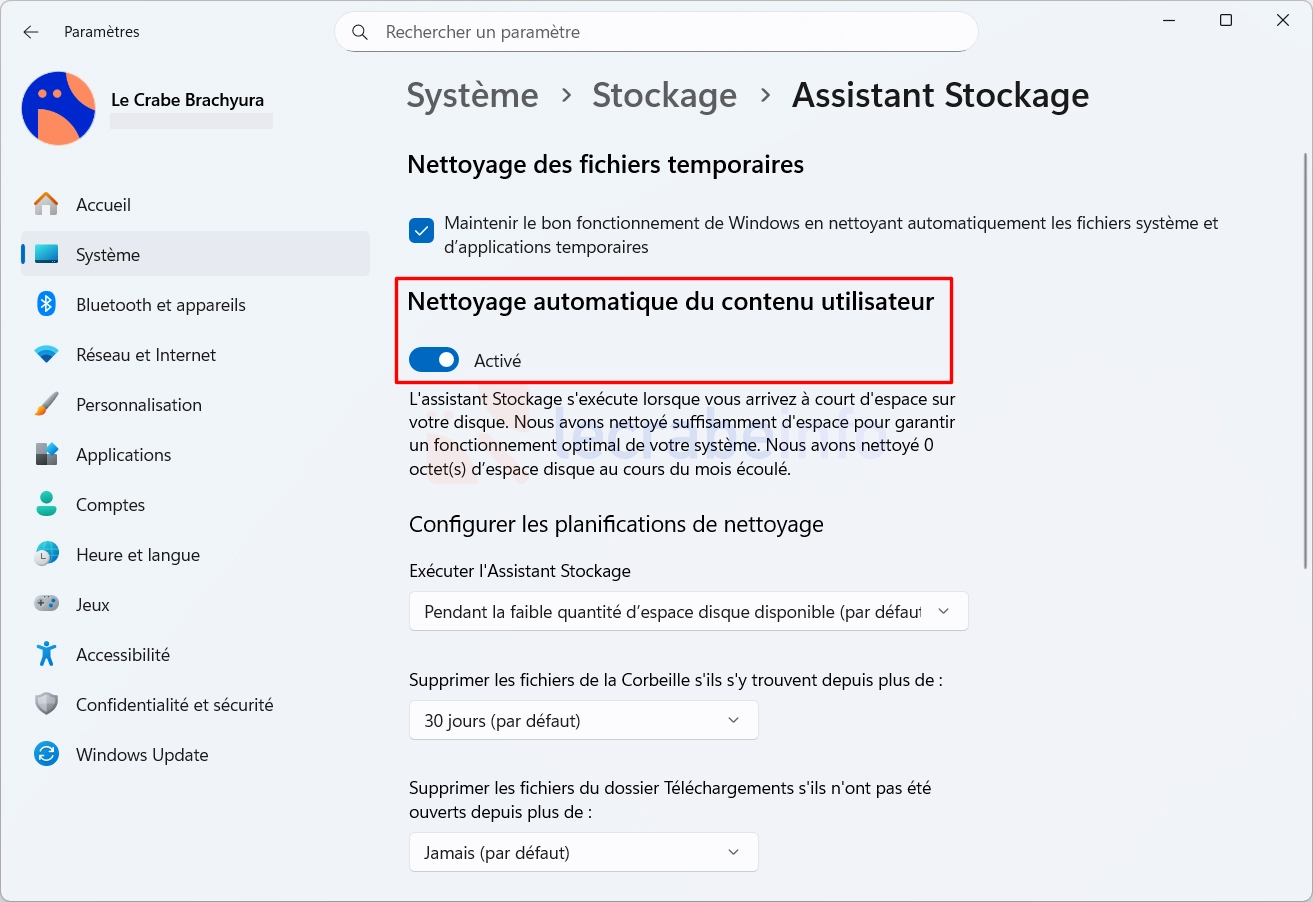 L’Assistant Stockage est l’outil intégré de Windows pour gérer automatiquement l’espace disque. Il permet à la fois de vider ponctuellement la Corbeille depuis les Paramètres et de programmer un nettoyage régulier sans que vous ayez à y penser. C’est une méthode intéressante si votre disque est souvent plein ou si vous voulez que Windows se charge du « ménage » à votre place.