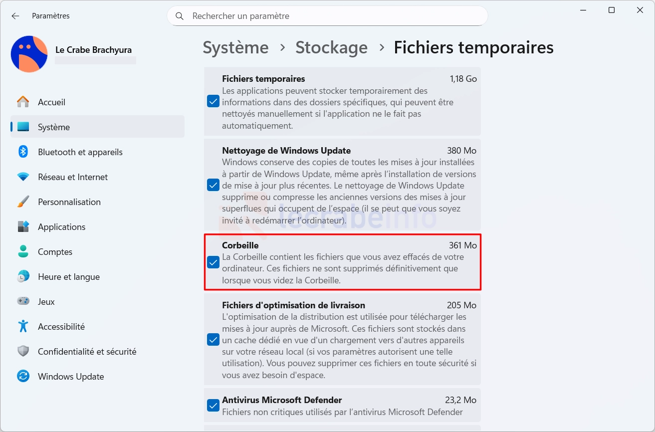 3. Dans la liste des éléments supprimables, cochez Corbeille et, si vous le souhaitez, d’autres catégories de fichiers temporaires à supprimer.