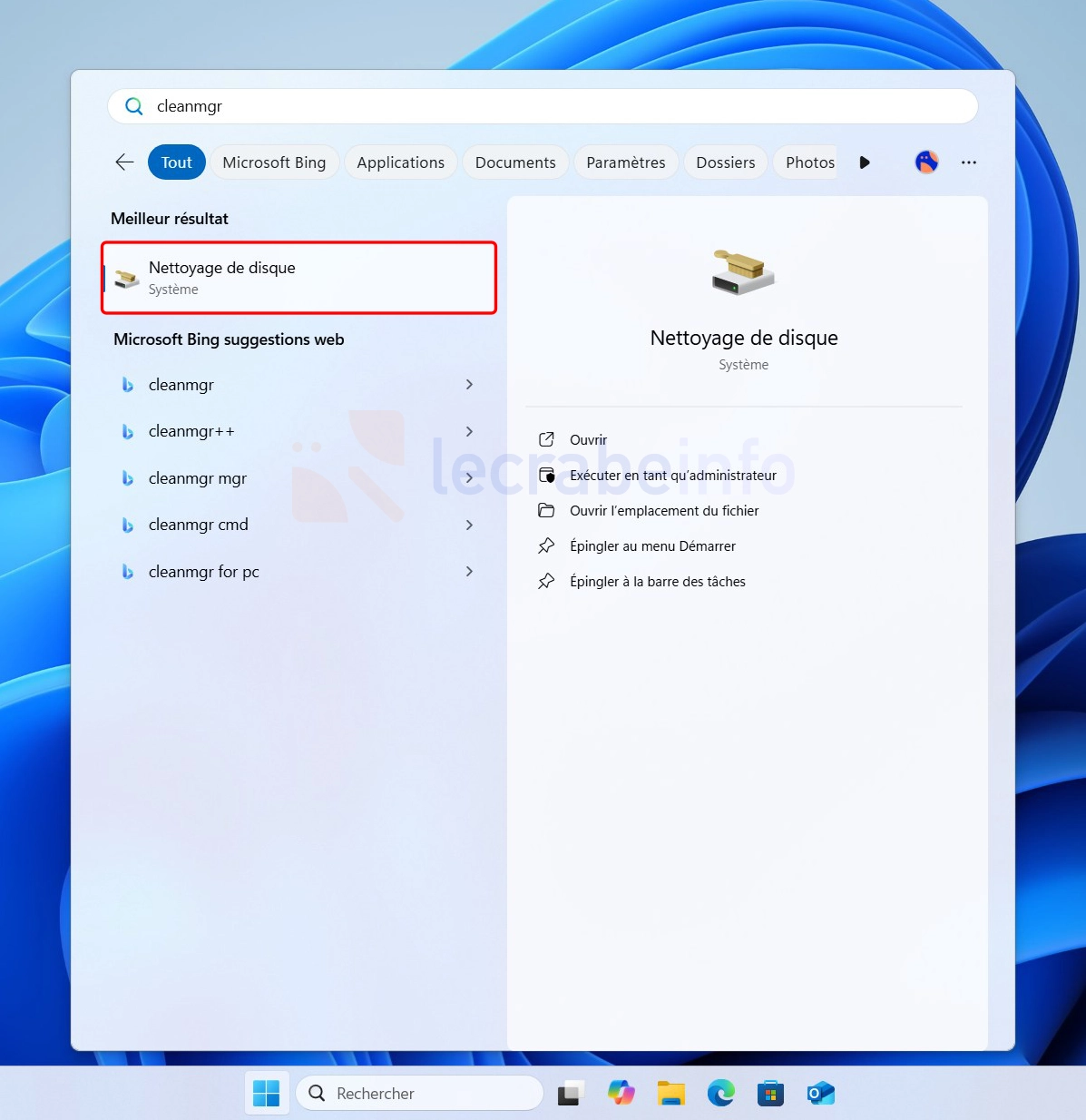 1. Ouvrez le menu Démarrer et tapez Nettoyage de disque ou cleanmgr.