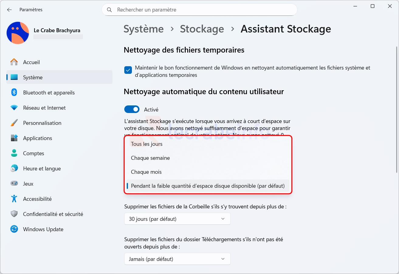4. Dans Exécuter l’Assistant Stockage, choisissez la fréquence d’exécution.