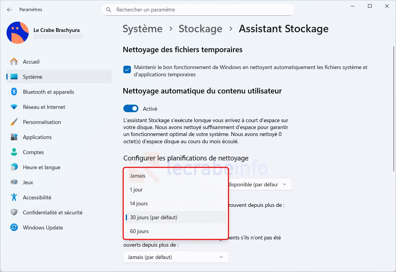 5. Dans Supprimer les fichiers de la Corbeille s’ils s’y trouvent depuis plus de, sélectionnez le délai au-delà duquel les fichiers seront supprimés automatiquement (par exemple 30 jours).